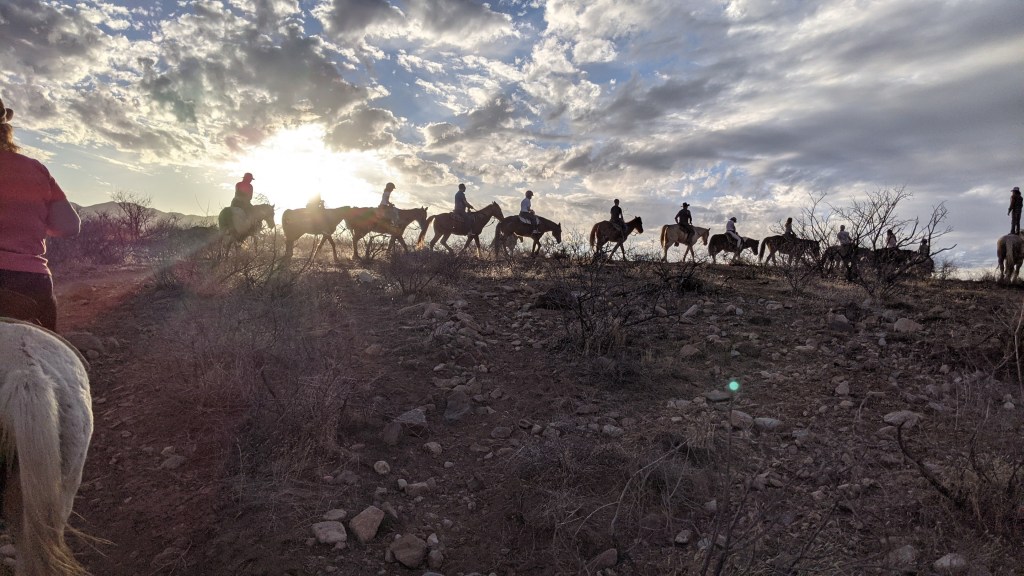 Seventy-five percent of the trail rides out there are large group rides. You’ll have 7 or more riders all going out together. One wrangler guide in the front leading the horse train and another in the back acting as a caboose and making sure there are no stragglers. For much larger groups (15+), one or more guides will be thrown in the middle to help keep the trail ride smooth and have additional eyes on the guests. If you are near any of the guides, the trail ride is filled with fun conversation. However, if you are not near any of the guides, you miss out on a lot as they may try to yell general trivia facts or information, but most of the time they are too far away to be heard. The opposite can be true if you are trying to ask questions and they aren’t able to hear you.