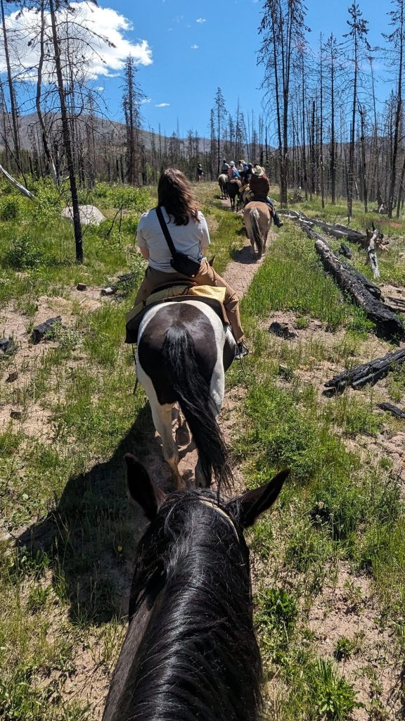 Sadly, it is not as easy as switching around the order. Wranglers have a system for placing horses in a specific order. You are first assigned a horse based on your experience level and weight and who is in your group. Then you are put in order primarily based on which horses get along and the horse’s speed. Slower horses are typically in the front so the faster ones push the slower ones to faster. It also prevents gaps forming in the horse train that will break up the group. Ultimately, the wranglers have the best judgement for knowing what horses prefer and what spot they like in the horse train. The biggest thing to remember is that horses act like siblings. Yes, siblings get along, but they still like to pick on each other when mom and dad aren’t looking! Wranglers take this into consideration as well when determining the order for the group.