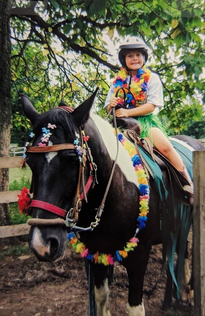 My interest in horseback riding stems from my mother. She grew up riding and competing in dressage and county fair competitions throughout her childhood and early adult life. While my family couldn’t have a horse due to living in the suburbs, my mom made sure to let me attend various horse camps growing up. My most memorable horse camp was when I was nine. This horse camp did a parade around the farm at the end of the week, and we were able to decorate our horses. My horse’s name was Echo, and she was a stubborn sweetheart! The theme I chose to do was “Hawaii”. I took a bunch of plastic leis and connected them to make a huge horse sized lei. My mom and I took a huge piece of green fabric and cut it to look like a grass skirt. I even wore my own fake lei and grass skirt. It was a lot of fun and a memory to last time!