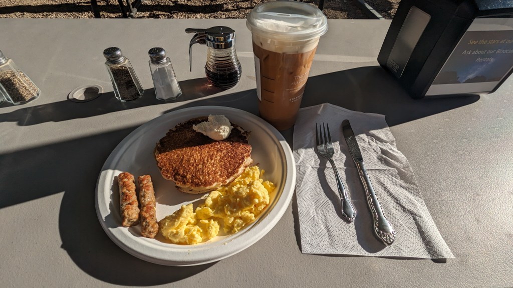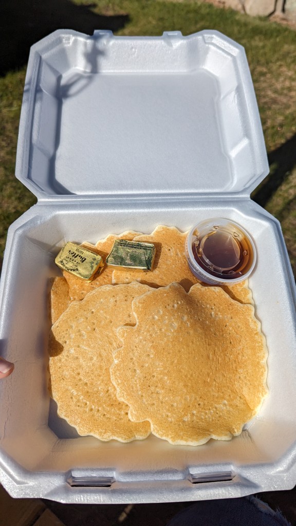 I am happy to say that since 4th of July is a holiday, the Alamosa KOA served up a pancake breakfast. The cherry on top? For $6, you get unlimited pancakes! What a deal? I am also pleased to report that the pancakes are delicious and served with butter and a side of sausage and eggs! I couldn’t help but enjoy drizzling yummy maple syrup all over my pancakes!
