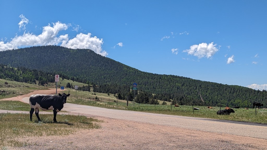 Once we had enough, we decided to drive around the area of Cripple Creek and Victor. It was nice to see various mountain scenery. There are some amazing views but for the most part, it was ok. After reaching Victor, we decided to circle back to the KOA. As we left town there were cows that had gotten out of their fenced area. Once just stared at us in my car trying to decide if we were ok or not. There was another that had decent horns that I hoped just minded its own business.
