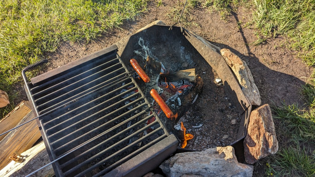 I really tried to find as much as could for us to do but I decided to wave the white flag. Once we got back, we just laid down and did our own thing for a few hours. Dinner time rolled around, and I was able to get firewood ordered to be delivered to the campsite. One thing I’ve found crucial to creating a great campfire is having a great fire starter. I personally like to use a fire starter that can burn long. Keep heat and allow smaller pieces to catch easier. I also have a nice tip to cook your hotdogs by using the campfire grill to rest your campfire stick on. This way you can cook your hotdog and still be able to multi-task.