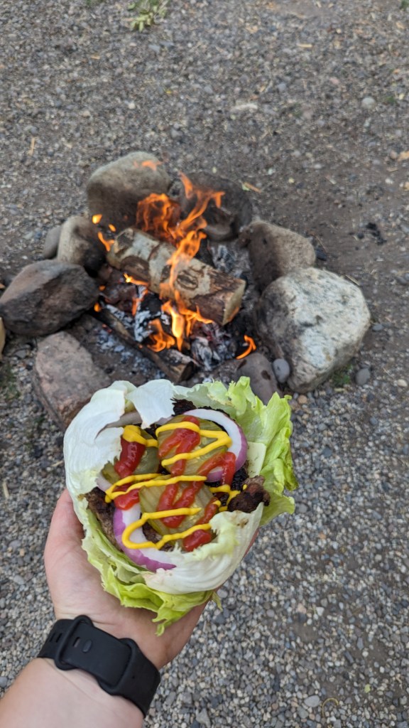 Cooking at this site was a challenge. The fire pit is a ring of shoe-sized rocks. I had to buy more firewood and was able to structure the firewood to hold my 12” cast iron skillet. Tonight’s menu was “unwich” hamburgers (I may have worked for Jimmy John’s in college). I used my cast iron to cook the burgers and even lined the bottom of my 8” cast iron skillet with foil and used it as a hamburger press! Delicious! I do love onions, pickles, ketchup, and mustard on my burger.