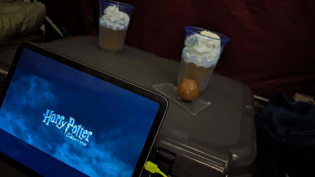 Tonight’s movie was Goblet of Fire. Complimented with my chocolate snitch – in honor of the quidditch world cup – and a homemade butterbeer (cream soda & butterscotch syrup topped with whip cream).
