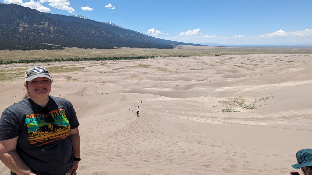 With tons of determination, a lot of “fun” words, and many breaks, we made it to the top of High Dune. It was hard, and it hurt, but it made us stronger. Wear tennis shoes. I was shocked by how many people wore Crocs or sandals. What many learned quickly is how hot the sand is. I can not walk in the sand barefoot. You will blister your feet from the heat! You can also rent sand sleds at various places nearby and slide down the dunes if you’d like. My sister and I were too tired to do that after hiking the High Dune.