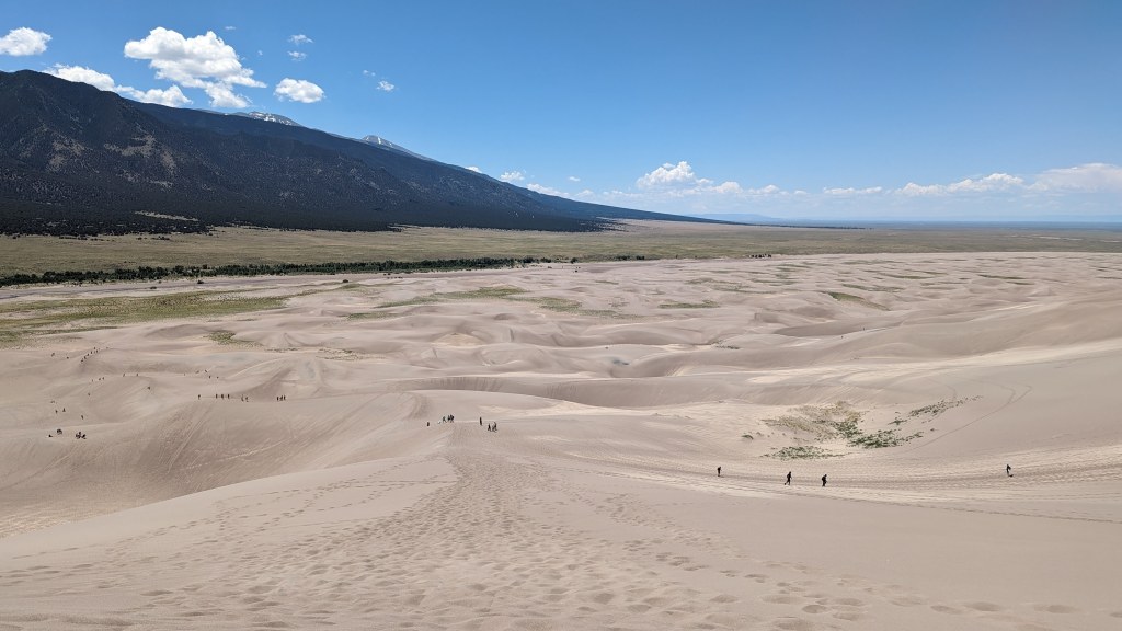 We set out at 10:30 and got to the main parking lot by 11AM. We lucked out that someone was backing out at the right time, but it was packed! I highly recommend getting there before 9:30AM. We started to set out to High Dune when we were attacked by vicious mosquitos! We had to retreat to the car and spray ourselves with bug spray. This is where I will also mention SUNSCREEN! There is ZERO shade at the Great Sand Dunes. Wear sunscreen and a hat. Bring water!