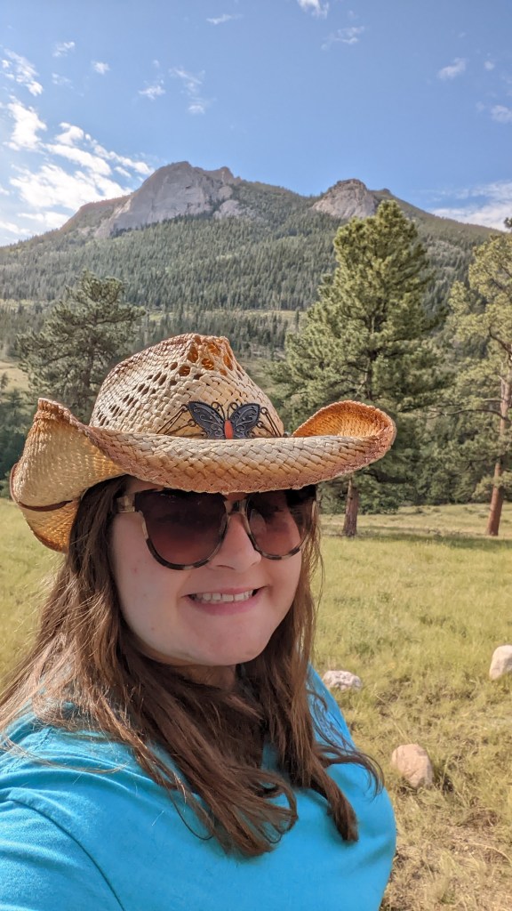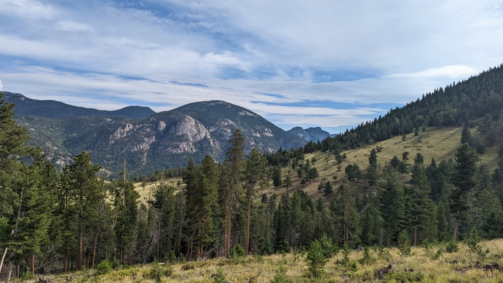 You’ll eventually ride to the National Park Gateway Intersection (my own name). If you have ridden a few rides with NPGS like I have, you find that there is a spot past the RMNP border where multiple trails cut off and what looks like carriage wheel tracks are seen in the small meadow. The wrangler guides claim that these are indeed wagon wheel tracks as that spot was a popular wagon road used since the 1800s. Nowadays, it is no longer in use. If you are on the 2-hour ride or going to Horseshoe Park, you’ll go straight. But if you are going anywhere in the Deer Mountain direction, you’ll go left and start the ascent to the peak. At this point, the views start to really take shape. You’ll pop out to a great spot that showcases the Horseshoe Park and Fall River Rd Valley. Don’t worry. The group will stop, and the wrangler guide will take pictures of each group with this stunning backdrop to commemorate the memory. As usual, though, pictures cannot capture the view as it appears in real-time.