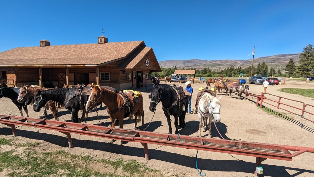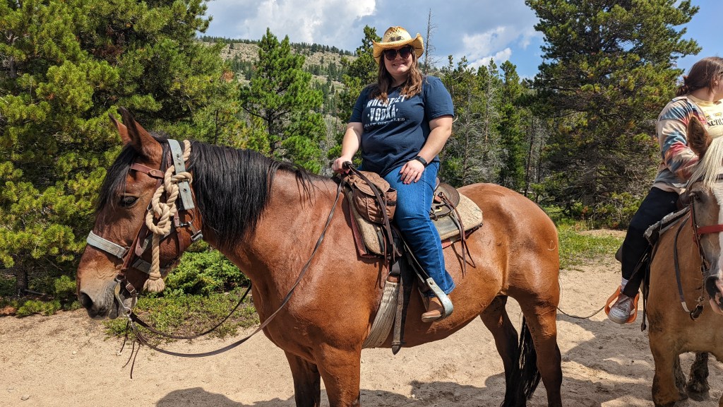 There are four options available to book a horseback ride at Sombrero Stables, National Park Gateway Stables, Glacier Creek Stables, and Winding River Resort. The first three are in or near Estes Park and the last one is in Grand Lake. I have ridden at all four places and my favorite is National Park Gateway Stables [NPGS] as it offers the most versatile ride length options with average prices. Early in the summer, I did a 2-hour trail ride and later in the summer, I did a 6-hour trail ride. The trails used by NPGS go either up in elevation or through Horseshoe Park (valley). You get great eye-catching scenery of the mountains that is just wonderful.