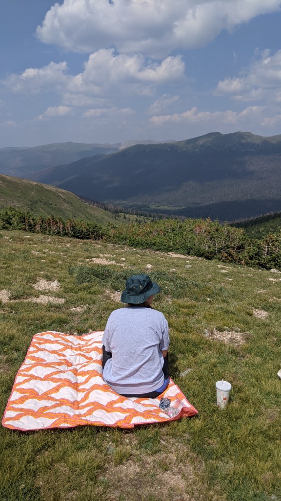 My favorite relaxing thing to do in RMNP is to pack a small charcuterie picnic with cheeses, olives, jams, and crackers along with a little bit of wine. Take Old Fall River Rd (a.k.a. Old Dirt Rd). Enjoy the gradual elevation gain in the comfort of your car. Take a quick stop at Chasm Falls. The old dirt road continues. When you’re near the end, you’ll see the Alpine Visitor Center. You’ll wind around a spot where people pull over to climb a bit of the mountain for a great view. I like to drive just past that. There is another pull-off and a great grassy spot to spread out a blanket.