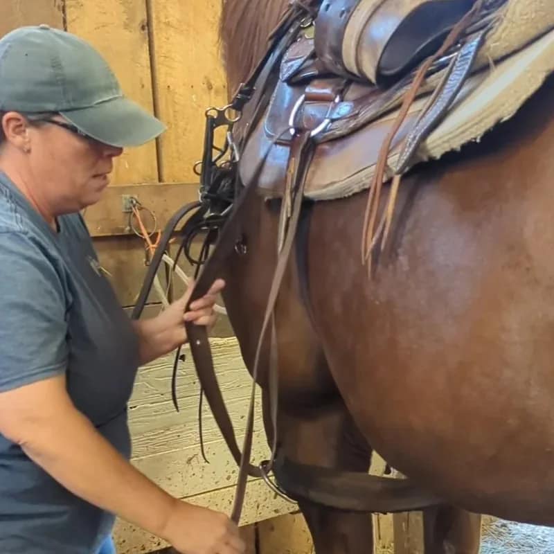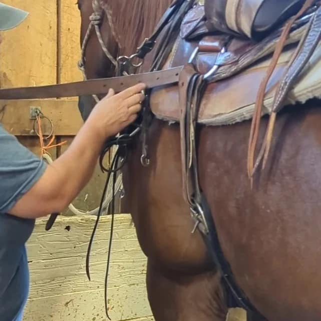 Walk back to the original side. Watching your feet, grab the girdle and pull across the belly underneath the horse. The girdle can’t touch the ground, but the cinch is usually pretty long and if you don’t watch it, it can get dirty in the ground below. The cinch loops into the girdle, then the saddle loop, and lastly the girdle again. That’s three belt buckle points. No more than 3 as too many loops can cause the leather to rub. This can hurt the horse and cause an uncomfortable lump beneath your leg while riding.