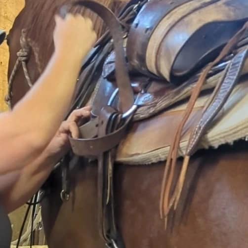 Don’t tighten the cinch until you are ready to ride and after the horse has water and warmed up with you on them for a few laps. Tightening the cinch too much too early can cause the horse to hate putting on a saddle. It’s like wearing shoes. Anytime you first put them on and tie the laces, it will feel tight but as soon as you take a small walk, your warmth loosens the shoe up, causing you to need to retie your laces.