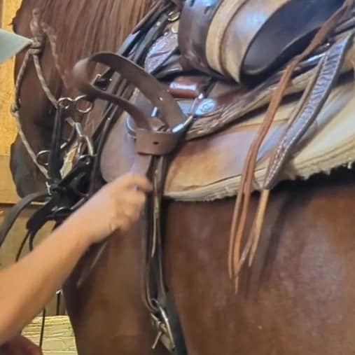 Place the saddle on the saddle pad from the left side of the horse. This is where you will connect the cinch and the girdle. You can place the right leg stirrup on the saddle horn to make it easier to place the saddle in its spot. Walk over to the other side of the horse and double-check that ties, the girdle, breast strap, etc., are not caught underneath the saddle and are untwisted. Place the untwisted breast strap, across the top of the neck for now.
